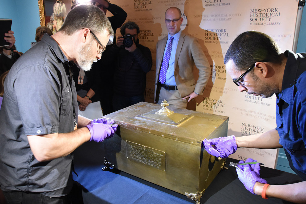 After several years studying the history of time capsules, I had the opportunity last week to be involved in the opening of one. A bronze chest, sealed on Wall Street in 1914 but forgotten for several decades, was belatedly opened at the New-York Historical Society, in the presence of a large crowd. I served as a historical consultant in the planning stages and speaker at the opening ceremony.